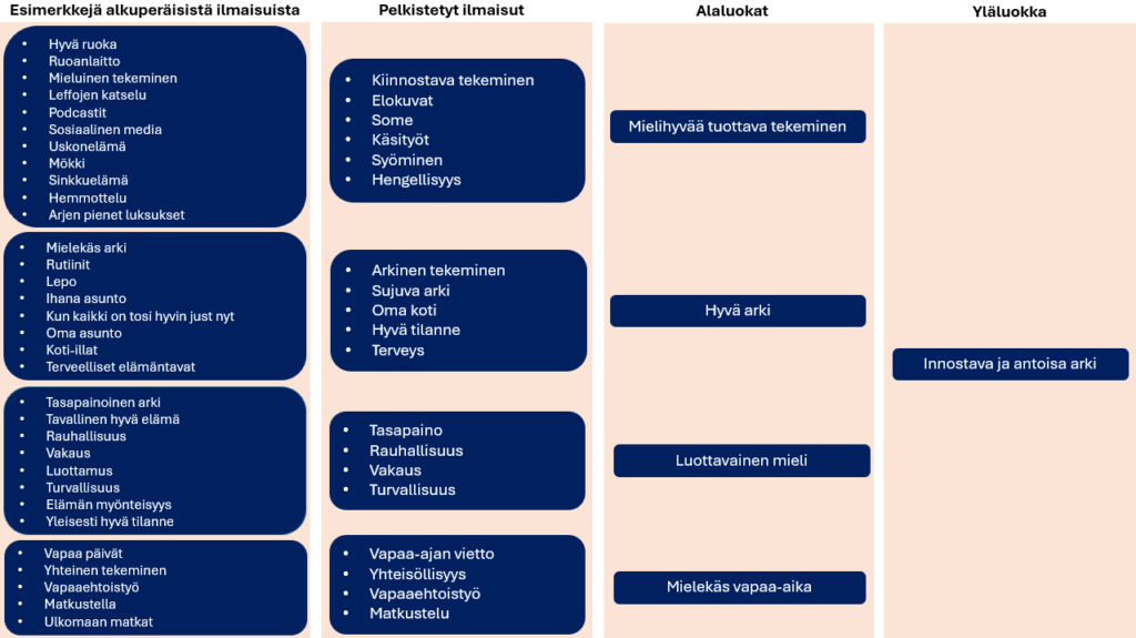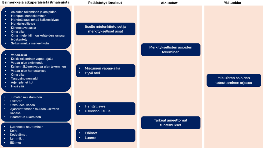 Kuvio 3. Esimerkki siitä, miten analyysi muodostui tyttöjen vastauksista innostavan ja antoisan arjen -yläluokassa.