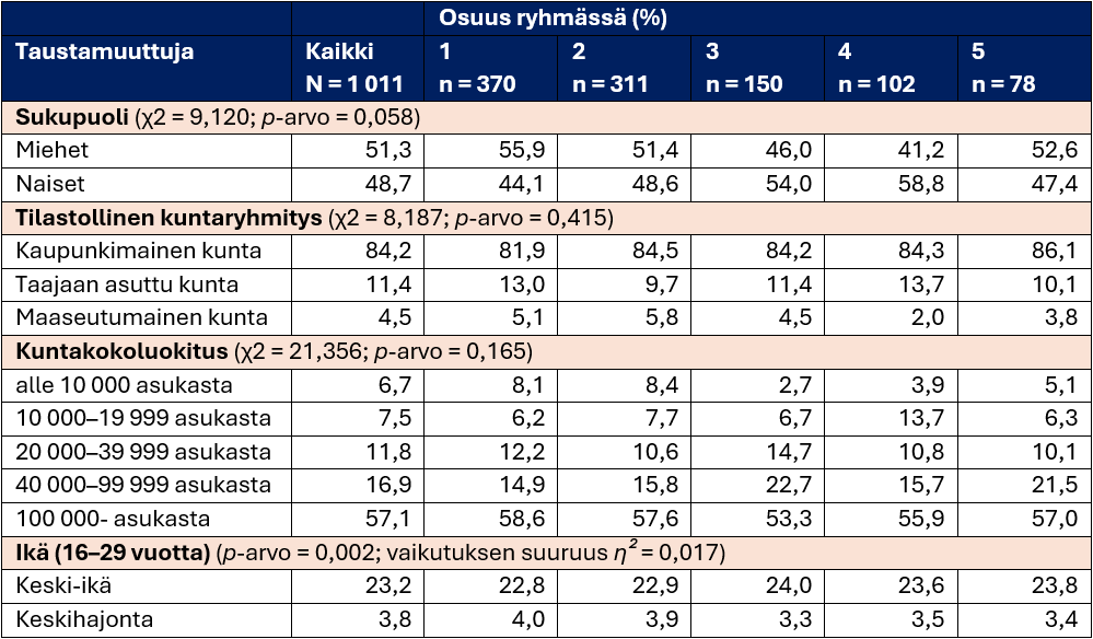 Kyselyaineistossa oli kysytty taustamuuttujina vastaajien ikää, sukupuolta ja asuinkuntaa. Näiden pohjalta aineistoon pystyttiin lisäämään myös kuntakokoluokitus ja tilastollinen kuntaryhmitys. Asuinalueen vaikutus koettuun elämäntyytyväisyyteen päätettiin tarkastaa, koska kuntakoko ja kuntatyyppi vaikuttavat sekä palvelujen tarjontaan että palvelutarpeeseen. Esimerkiksi maaseutumaisilla alueilla on enemmän terveyden ja hyvinvoinnin puutteita kuin kaupungeissa, mutta palveluja kuitenkin keskitetään syrjäseuduilta ja pienemmistä kunnista maakuntakeskuksiin (esim. Rantamäki ym., 2021). Ryhmittelyanalyysillä muodostettuja ryhmiä ristiintaulukoitiin eri taustamuuttujittain, ja ryhmien keski-iän eroja selvitettiin varianssianalyysin avulla. Taulukosta 2 näkee, että erot taustamuuttujien välillä eivät olleet ristiintaulukoinneissa tilastollisesti merkitseviä. Ryhmä 1 eli elämäntilanteeseensa tyytyväiset oli kuitenkin jonkin verran miespainotteisempi. Ryhmä 1 oli keski-iältään nuorin, 22,8 vuotta, kun taas esimerkiksi ryhmän 3 keski-ikä oli 24 vuotta. Ryhmien väliset erot olivat tilastollisesti merkitseviä, mutta iän vaikutus (effect size) tuloksiin oli hyvin pieni: ikä selitti vain noin 1,7 prosenttia tulosten kokonaisvaihtelusta. Käytännössä tämä tarkoittaa, että vaikka erot eri ikäryhmien välillä havaittiin, iän vaikutus ilmiöön on pieni.