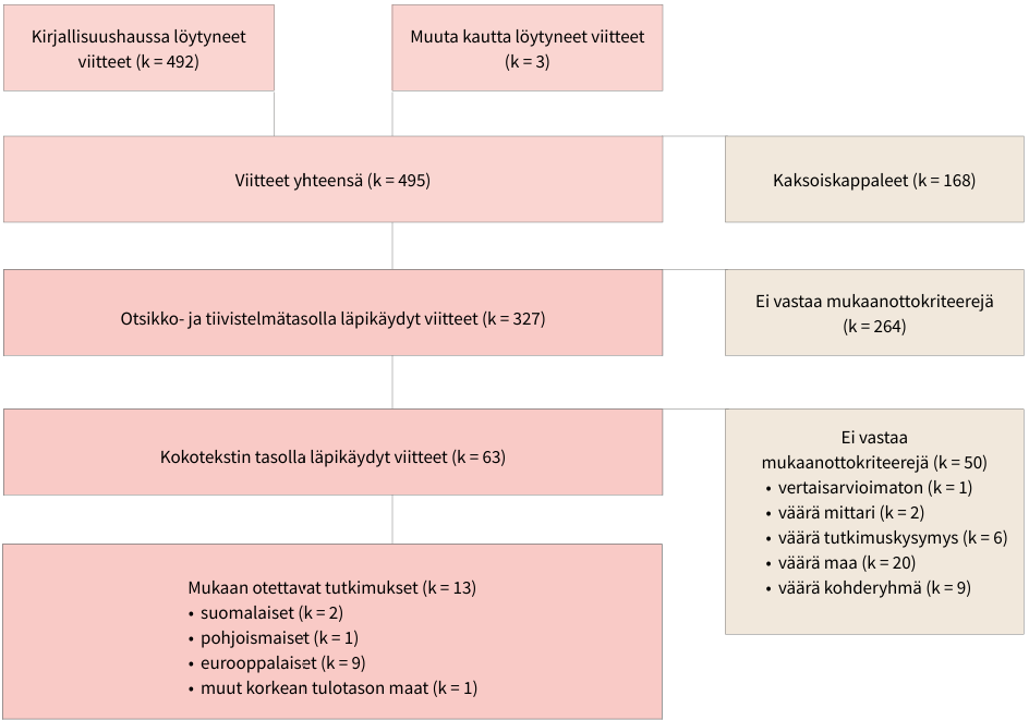 Hakustrategialla löydettiin yhteensä 495 viitettä, joista kaksoiskappaleita oli 168. Otsikot ja tiivistelmät käytiin läpi 327 viitteestä, joista 63 arvioitiin olennaisiksi. Niistä kuitenkin 50 viitettä suljettiin pois koko tekstin lukemisen jälkeen. Lopulta mukaan otettiin 13 artikkelia, joista kaksi oli suomalaistutkimuksia, yksi pohjoismainen, yhdeksän muualla Euroopassa ja yksi muussa Maailman pankin luokittelemassa korkean tulotason maassa tehty tutkimus. Haun eteneminen on kuvattu vuokaaviossa (Kuvio 1). UCLA-LS-mittaria ei ole arvioitu norjalaisessa PsykTestBarn– tai ruotsalaisessa Metodguiden-tietokannassa.
