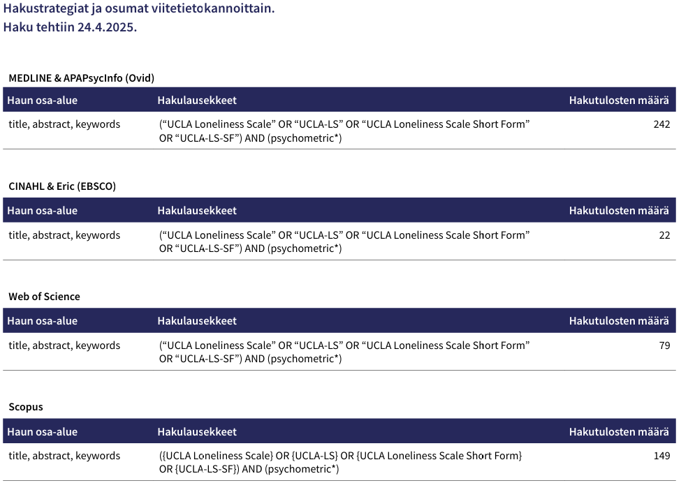 Kirjallisuushaku tehtiin 24.4.2025 systemaattisena hakuna seuraaviin tietokantoihin: MEDLINE, APA PsycInfo, CINAHL, ERIC, Scopus ja Web of Science. Haussa käytettiin UCLA Loneliness Scale -mittarin nimiä sekä psykometriikkaan perustuvaa strategiaa (liite 1). Lisäksi huomioitiin mahdolliset muuta kautta esiin nousseet julkaisut. Mukaan otettiin kaikki 2000-luvulla julkaistut tutkimukset, jotka on tehty Maailmanpankin luokittelemissa korkean tulotason maissa, ja jotka raportoivat ja arvioivat UCLA-LS-mittarin osalta vähintään yhtä seuraavista: