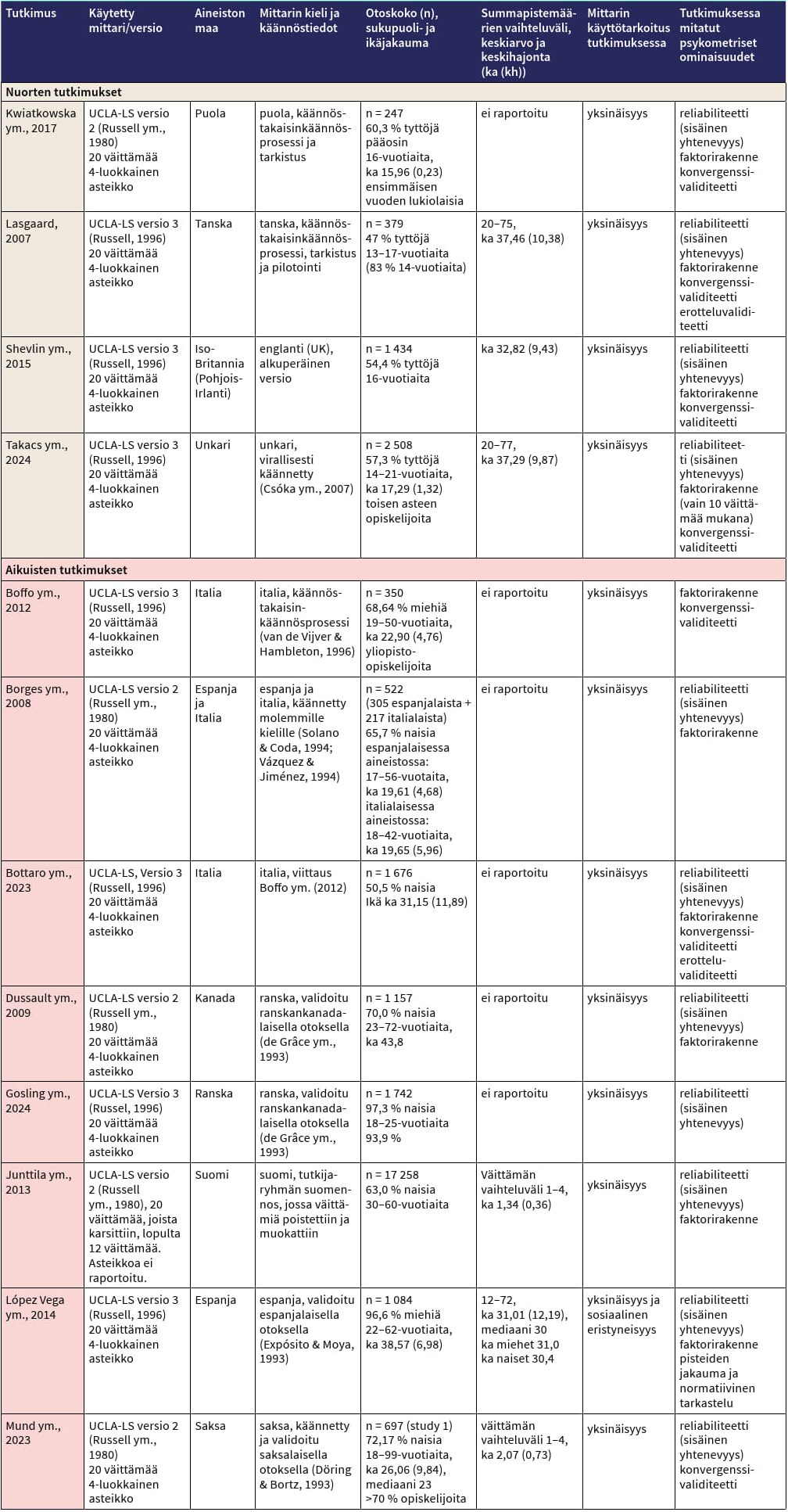 Mukaan otetuista tutkimuksista viisi (Borges ym., 2008; Dussault ym., 2009; Junttila ym., 2013; Kwiatkowska ym., 2017; Mund ym., 2023) käsitteli UCLA-LS-mittarin toista versiota (Revised UCLA Loneliness Scale; Russell ym., 1980) ja seitsemän tutkimusartikkelia (Boffo ym., 2013; Bottaro ym., 2023; Gosling ym., 2024; Lasgaard, 2007; López Vega ym., 2014; Shevlin ym., 2015; Takacs ym., 2024) mittarin kolmatta versiota (UCLA Loneliness Scale Version 3; Russell, 1996). Junttila ym. (2015) muokkasi oman versionsa UCLA-LS-mittarin toisesta ja kolmannesta versiosta. Nuorilla tehdyissä tutkimuksissa oli käytetty toista versiota yhdessä ja aikuisilla neljässä, vastaavasti kolmas versio oli käytössä nuorten tutkimuksissa kolmessa ja aikuisilla neljässä tutkimuksessa. Katsaukseen valikoitujen tutkimusten joukossa oli UCLA-LS-mittarista useita eri kieliversioita: suomen-, tanskan-, saksankielinen, puolan-, unkarin-, ranskan-, italian- ja espanjankielinen käännös. Suurin osa käännöksistä oli toteutettu yleisesti hyväksyttyjen käännöskäytäntöjen mukaisesti.