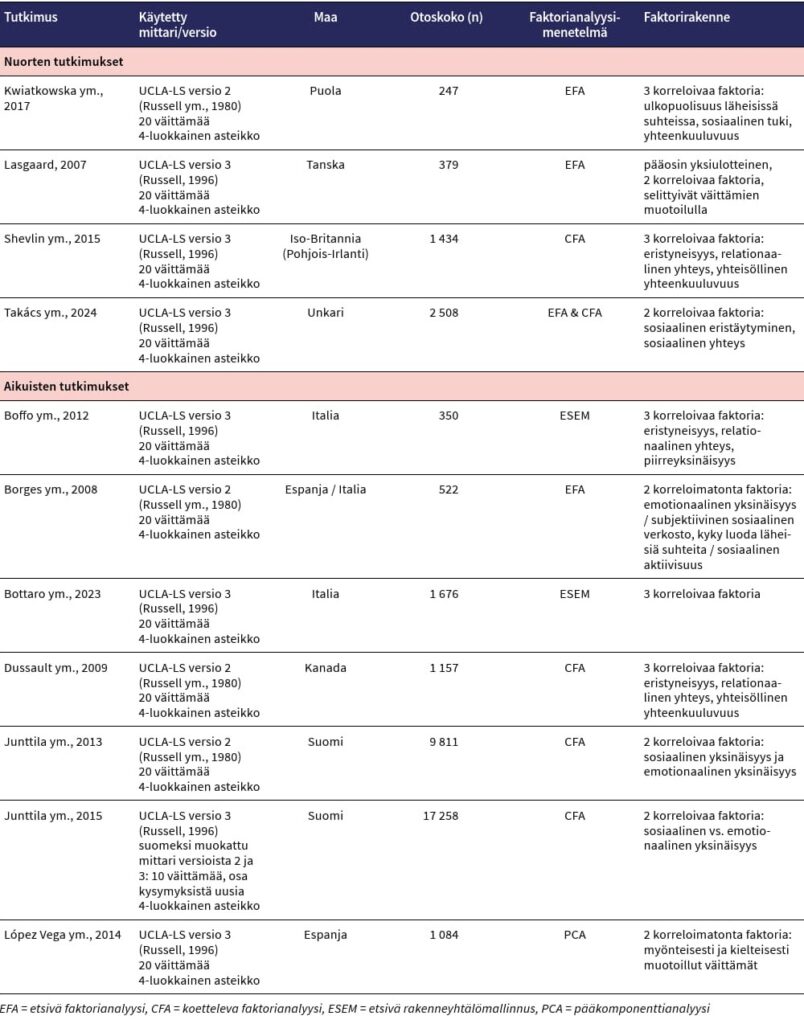 Taulukossa 2 on esitetty nuorilla ja aikuisilla tehdyissä tutkimuksissa havaitut UCLA-LS-mittarin faktorirakenteet. Nuorten tutkimuksissa etsivän ja koettelevan faktorianalyysin perusteella mittarilla on yksiulotteinen rakenne yhdessä tutkimuksessa (Lasgaard, 2007), kahden faktorin rakenne yhdessä (Takács ym., 2024) tutkimuksessa sekä kolmen korreloituneen faktorin rakenne kahdessa tutkimuksessa (Kwiatkowska ym., 2017; Shevlin ym., 2015). Aikuisten tutkimuksissa etsivän ja koettelevan faktorianalyysin, etsivän rakenneyhtälömallinnuksen ja pääkomponenttianalyysin perusteella mittarilla on kahden tai kolmen faktorin rakenne eri väestöissä (Boffo ym., 2012; Borges ym., 2008; Bottaro ym., 2023; Dussault ym., 2009; Junttila ym., 2013; Junttila ym., 2015; López Vega ym., 2014). Tulokset tukevat mittarin moniulotteisuutta sekä nuorten että aikuisten aineistoissa. Mahdollisista metodivaikutuksista mittarin faktorirakenteeseen raportoivat kaikki muut paitsi Junttila kumppaneineen (2015) sekä Bottaro kumppaneineen (2023). Junttilan ym. (2015) tutkimuksessa käytettiin vain kielteisesti muotoiltuja väittämiä. Kahdessa (Gosling ym., 2024; Mund ym., 2023) aikuisia koskevassa tutkimuksessa ei tarkasteltu faktorirakennetta.