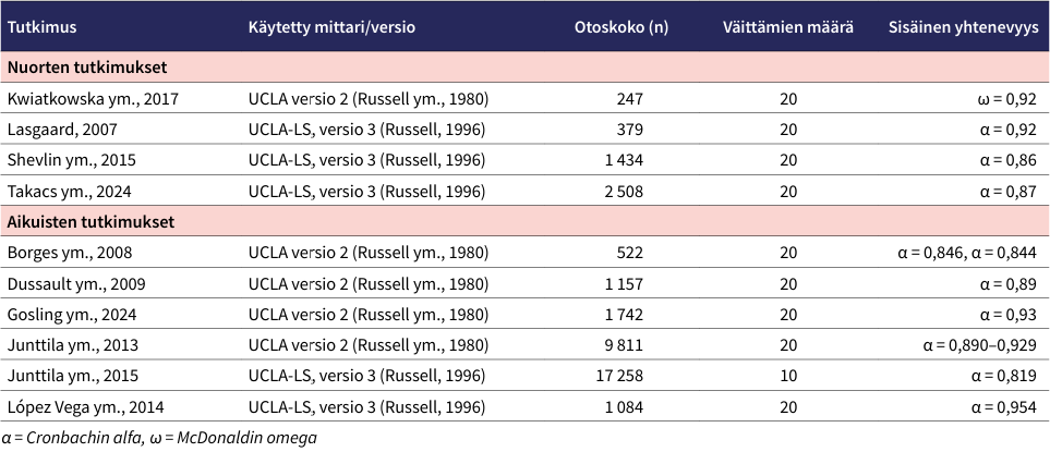 Aikuisia koskevissa tutkimuksissa mittarin väittämien sisäinen yhtenevyys oli yhtä lailla korkealla tasolla. Lyhennetyn UCLA-LS-mittarin suomalaisversion (Junttila ym., 2013; Junttila ym., 2015) alfakerroin osoitti taulukon pienintä mutta silti hyväksyttävää sisäistä yhtenevyyttä. Boffon ym. (2012) tutkimuksessa käytettiin toista reliabiliteettikerrointa (Factor determinacy coefficient). Mundin ym. (2023) tutkimuksessa ei arvioitu UCLA-LS-mittarin väittämien sisäistä yhtenevyyttä.
