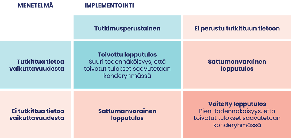 Jotta näyttöön perustuva menetelmä voi lunastaa sille asetetut tavoitteet ja tuottaa tutkimuksissa todetun hyödyn lapsille, nuorille ja perheille, tulee menetelmä implementoida huolellisesti. Menetelmien implementoinnilla eli käyttöönotolla2 tarkoitetaan suunnitelmallista ja tavoitteellista prosessia, joka takaa, että näyttöön perustuva menetelmä juurtuu osaksi menetelmää toteuttavan tahon käyttökontekstia (Fixsen ym., 2005; Kouvonen ym., 2023). Kuviossa 1.2 on esitetty neljän eri lopputuloksen todennäköisyys menetelmän tuottamalle hyödylle kohderyhmässä. Nelikentässä on esitetty menetelmän ja implementoinnin lopputulokset. Suurin todennäköisyys saavuttaa toivotut tulokset kohderyhmässä on, kun menetelmän vaikuttavuus on tutkimusten avulla todettu ja implementointi on tutkimusperustaista.