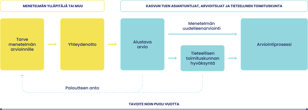 Menetelmän arviointiin pääsy on kuvattu kuviossa 3.1. Kun on kyse päivitettävästä menetelmästä, prosessi muistuttaa uuden menetelmän arviointiin pääsyä. Uutta tieteellisen toimituskunnan hyväksyntää ei tarvita. Tarve päivittämiselle voi nousta myös sisäisesti Kasvun tuessa, jolloin menetelmästä tehdään alustava arvio ja pohditaan, mikä olisi päivitettävien menetelmien arviointijärjestys. Joka tapauksessa menetelmäarvioiden ajankohta tarkistetaan vuosittain ja päivittämisen tarvetta pohditaan.