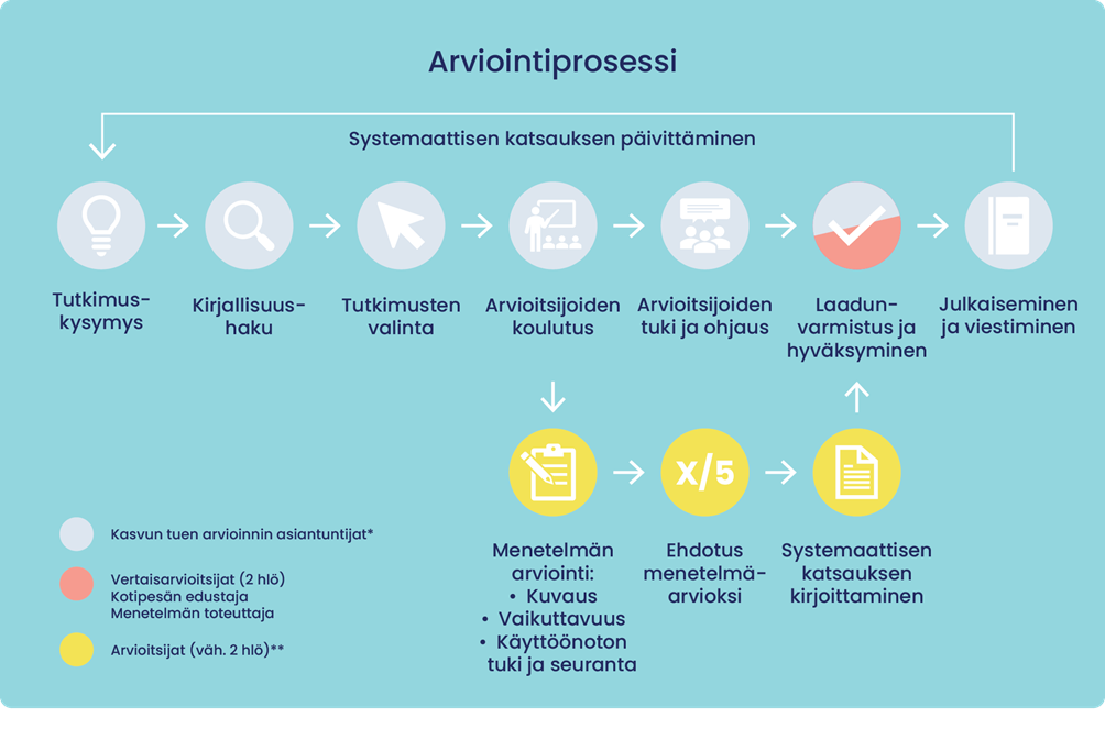 Oppaan arviointiprosessi keskittyy vaikuttavuuden arviointiin, mutta myös menetelmän kuvauksen sekä käyttöönoton tuen arviointeihin. Menetelmän kuvaus on erityisen tärkeä, koska sen avulla vaikuttavuustutkimuksissa arvioitu psykososiaalinen menetelmä voidaan todentaa kotipesän levittämää menetelmää vastaavaksi. Käyttöönoton tuki puolestaan tukee vaikuttavan menetelmän toteutumista käytännössä. Arviointiprosessi huomioi vaikuttavuuden lisäksi myös turvallisuuden. Jos tutkimuskirjallisuus antaa viitteitä menetelmän haitallisuudesta, niin menetelmä voi saada arvion: kielteisiä vaikutuksia. Menetelmien mahdollinen kustannusvaikuttavuustieto on mukana systemaattisissa katsauksissa.
