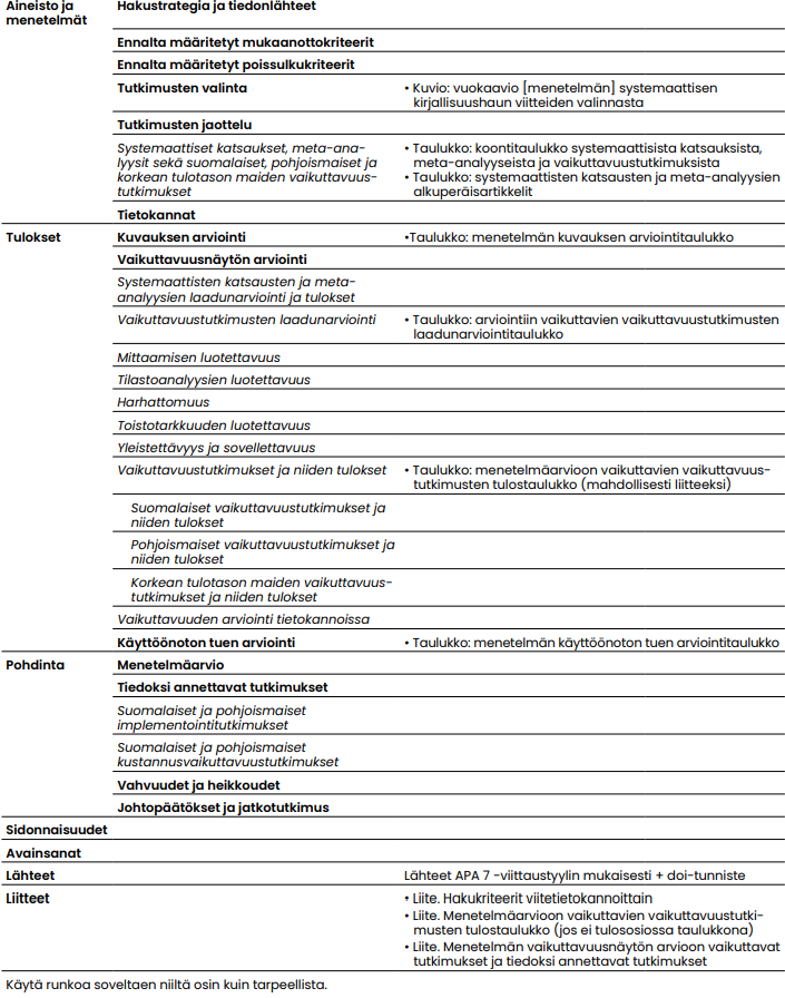 • Oppaaseen viitataan näin: Merikukka, M., Backman, H., Heikkilä, L. & Kurki, M. (2025). Lasten ja nuorten mielenterveyttä edistävien psykososiaalisten menetelmien vaikuttavuus – Opas näytön systemaattiseen arviointiin. Itlan oppaat ja käsikirjat 2025:1
