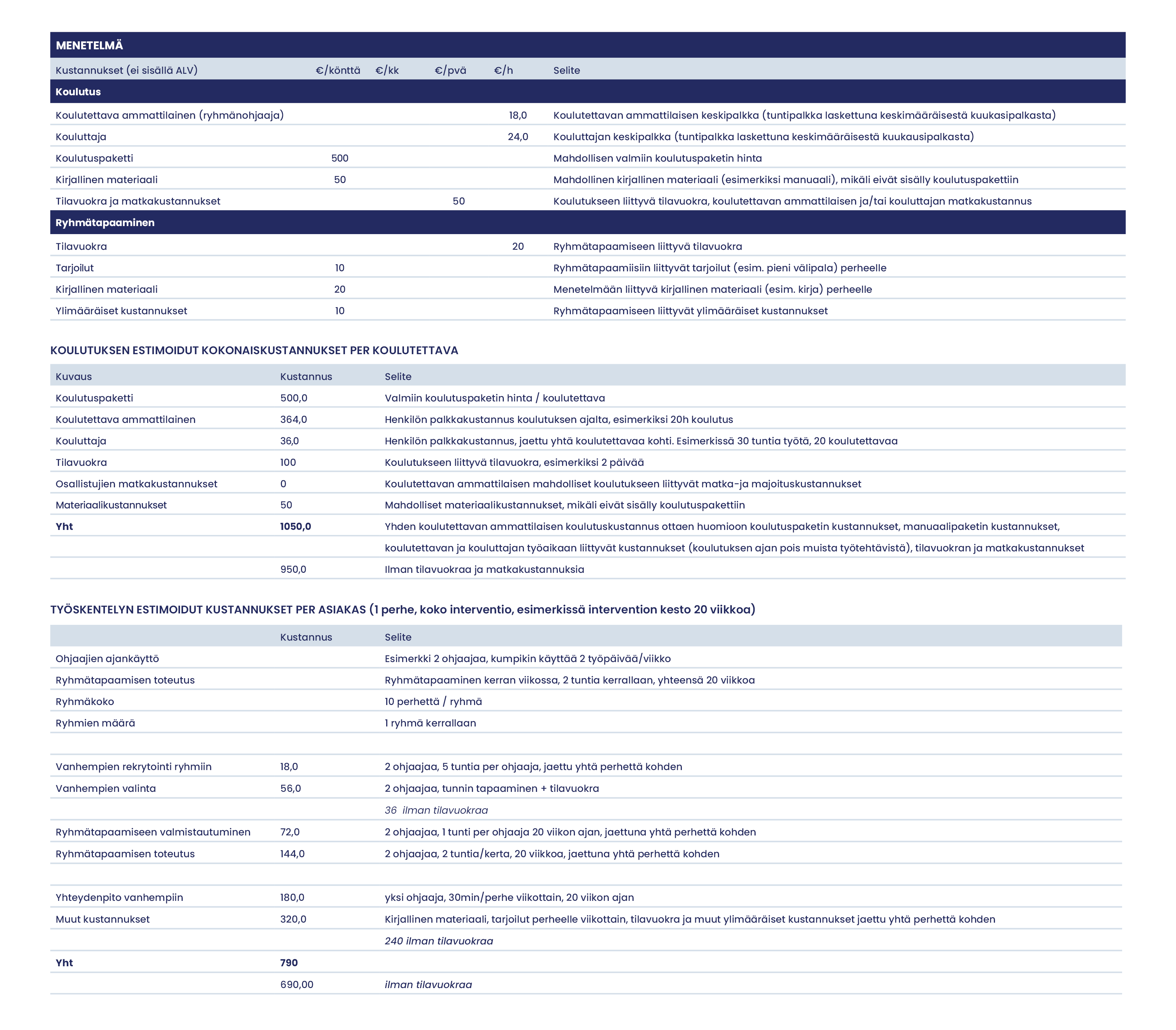 Matka- ja majoituskustannukset sekä tilavuokrat jätettiin pois laskelmista niihin liittyvän suuren vaihtelun vuoksi. Menetelmän käyttöön ottavan organisaation tulisi kuitenkin ottaa ne omissa laskelmissaan huomioon.