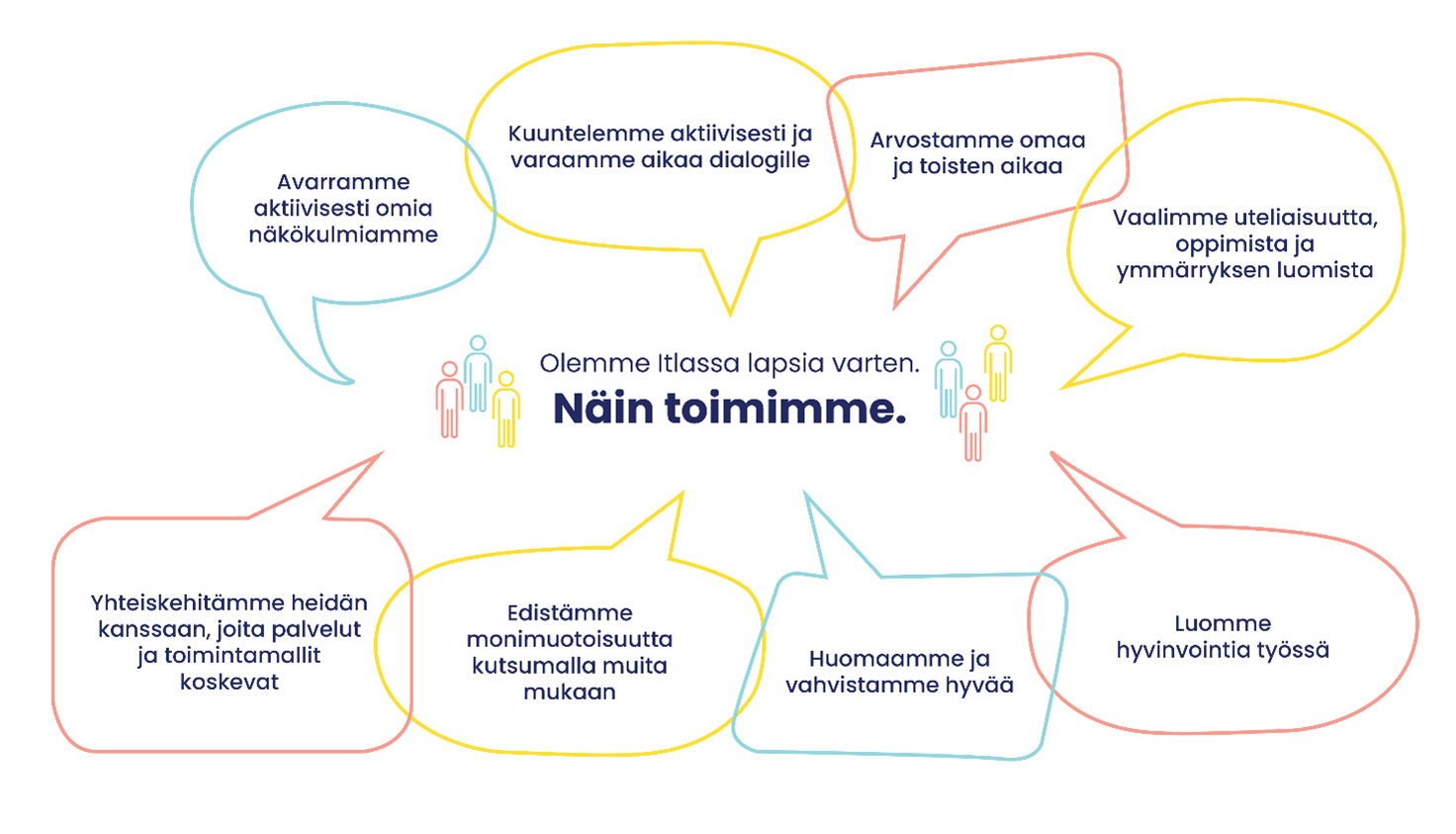 Yhteistyö, kumppanuudet ja verkostot ovat Itlan toimintamallin ytimessä. Toimimme aktiivisena sillanrakentajana ja niin sanottuna välittäjäorganisaationa. Yhdistämme, välitämme ja jalostamme tutkimuksesta ja käytännön kehittämistyöstä syntyvää tietoa, osaamista ja innovaatioita ja edistämme laadukkaan tiedon hyödyntämistä päätöksenteossa. Alla oleva kuva kiteyttää periaatteet, joita vaalimme kaikessa yhteistyössä.