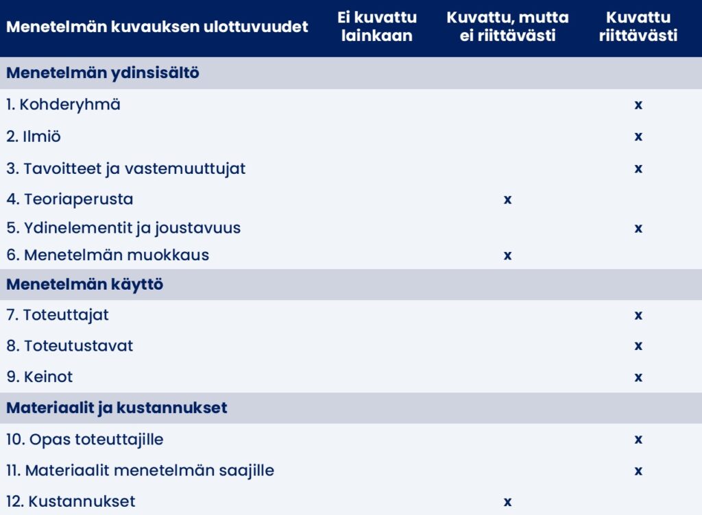 Menetelmän vaikuttavuusarvio koostuu sekä menetelmäkuvauksen että menetelmästä tehtyjen vaikuttavuustutkimusten luotettavuuden arvioinnista. Voit tutustua osa-alueiden arviointeihin tarkemmin sivun seuraavissa osioissa. Arvion voi lukea kokonaisuudessaan systemaattisena kirjallisuuskatsauksena (pdf).