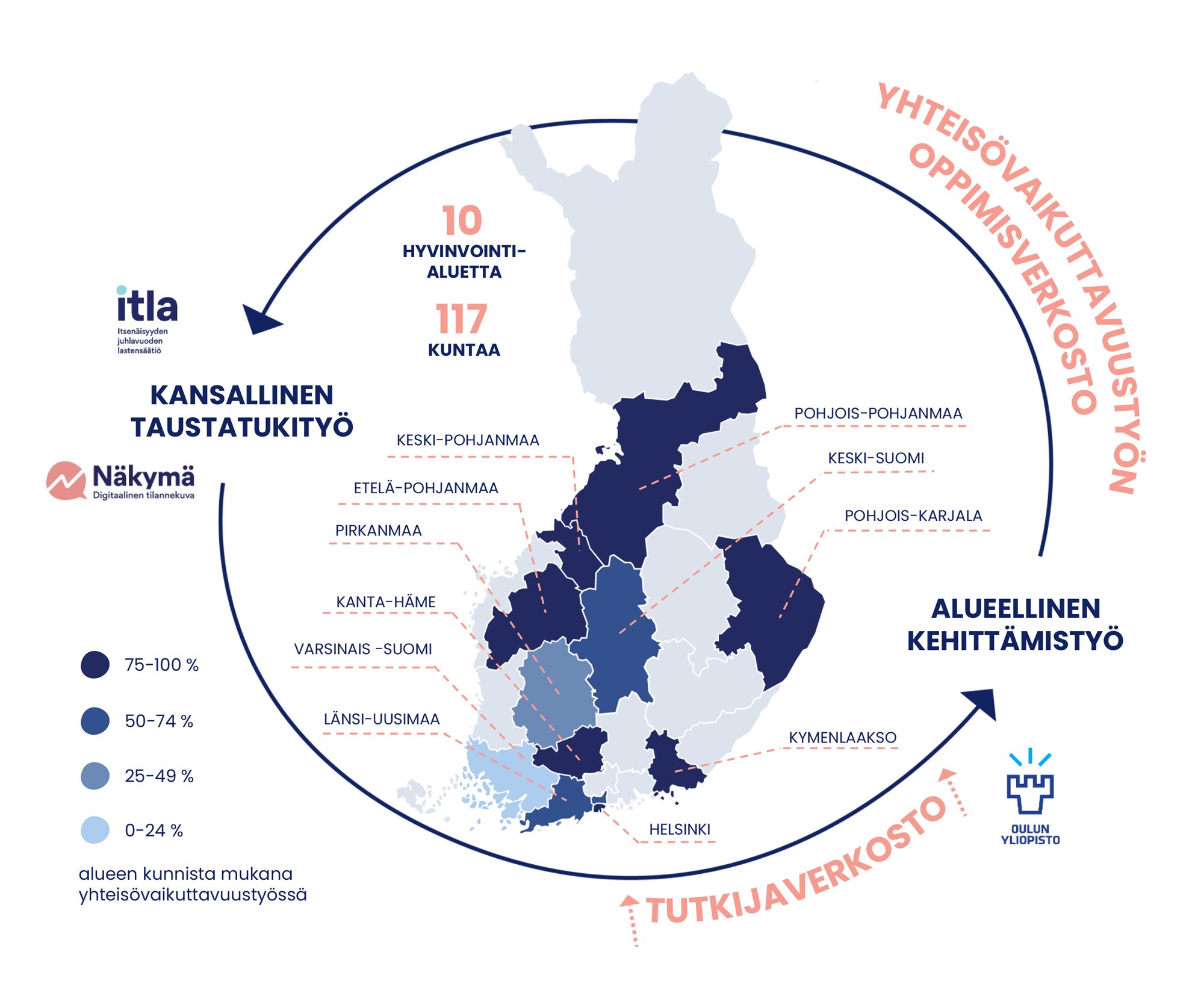 Itla toimii yhteisövaikuttavuustyössä mukana olevilla alueilla käytännön työn ja johtamisen tukena sekä tuo koti- ja kansainvälistä tutkimus- ja kokemustietoa käytännön ratkaisujen tueksi. Edistämme paikallisten organisaatioiden yhdessä oppimista ja toiminnan uudistamista.